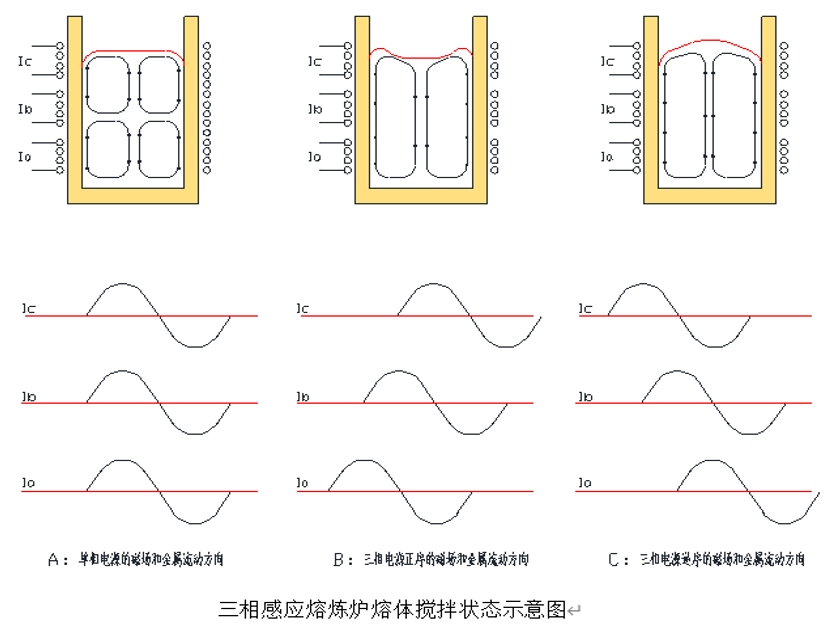 【技術總結】三相攪拌熔爐通過創新的三維電磁場設計(如圖1線圈布置),結合智能相序控制系統,可有效解決傳統單相爐的金屬分層問題。其旋轉磁場產生的軸向攪拌力使熔體實現三維對流(如圖2流動示意),顯著提升合金攪拌熔煉爐的成分均勻性和熔煉效率,是高端金屬材料制備領域的優選設備方案。